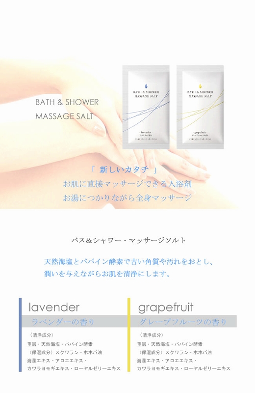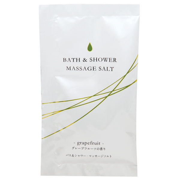 シャワーだけでもOK!直接マッサージできる入浴剤が登場!お肌をなめらかにひきしめる全身美容マッサージソルト(1回分)。天然海塩とパパイン酵素が古い角質や汚れを落としお肌をひきしめます。さらに6種類の保湿成分を配合し、しっとりなめらかなお肌へと導きます。使用方法はお肌を濡らした後、全身にパックし軽くマッサージして十分に洗い流します。マッサージ後洗い流さずにそのままの入浴も可能!もちろん入浴剤としてもご使用頂けますので、お風呂に浸かりながらの全身マッサージも出来ちゃいます。爽やかなグレープフルーツの香りに包まれながら、素敵なバスタイムをお楽しみ下さい。※お肌をいためる原因になりますので、強くこすりつけないで下さい。頭皮のマッサージにもお使い頂けますが、目に入らないようご注意下さい。