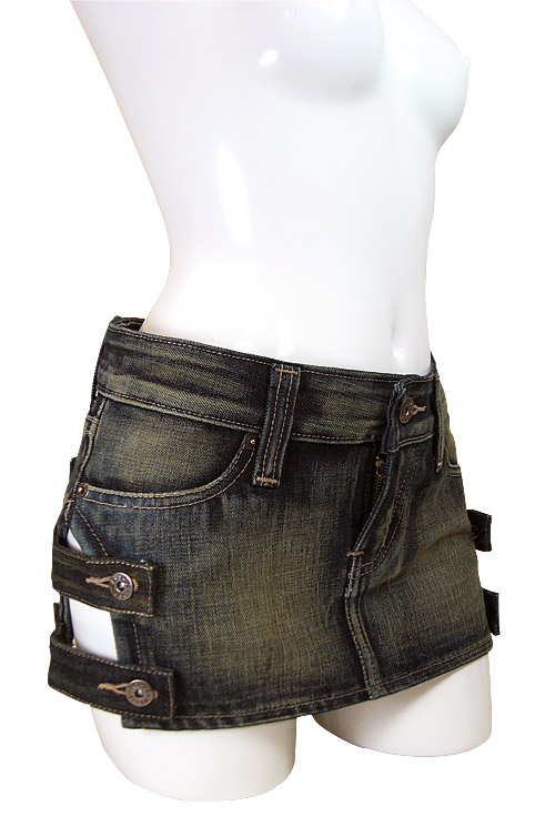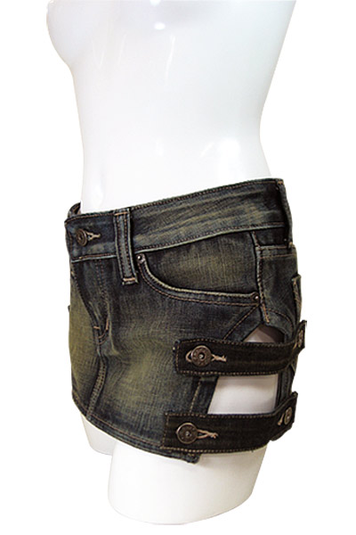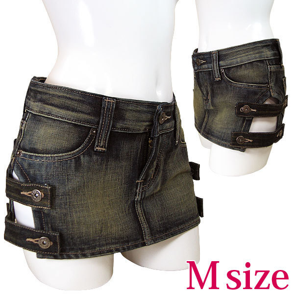 両サイドの太股部分をカット!チラ見えセクシーなデニムのミニスカート(M)。人気のデニム生地を使用した、ヒップハンガーのセクシーコスチューム!両サイドを大胆にカットして、ボタン留めのベルトデザインに仕立てました。裾の一段だけベルトを外したり、片側だけ外してもう片方をクロスさせてみたり、アレンジするのも面白そう!※XLサイズ(b18368)あります