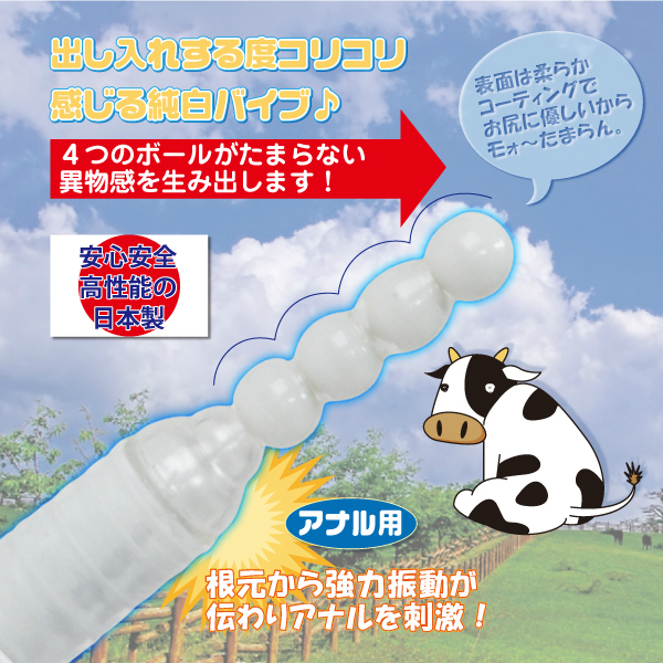 ミルキーな4つの玉が連結!お尻に優しいコーティング仕様のアナルバイブ。ミルクのように真っ白な玉を4つ連ねた国産アナルバイブは、単4電池×3本が作り出す強力な振動が自慢!自在に曲がる挿入部分の先端まできちんと伝わって、肛門も腸内も刺激します!操作はスライドのみで簡単!バイブレーションを無段階に調節できて便利です。