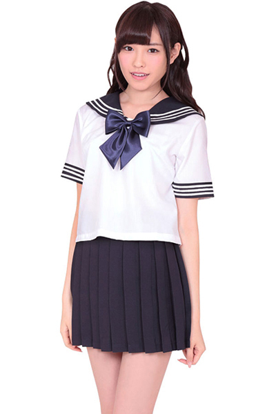 青春時代を思い出させる本格的な制服コスチューム。セーラー服の定番、白のブラウスにプリーツスカートのセット!胸元には紺色リボンをトッピング!袖と襟の白い3本ラインが学生らしいデザイン!可愛いセーラー服コスチュームに身を包んで、思い出に浸っちゃって下さい。