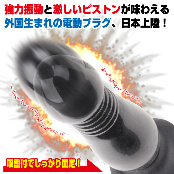 強力吸盤で固定力抜群!ソフトブラック樹脂製、ピストン機能付き電動アナルプラグ。亀頭のようなカリ下をジャバラに設計して、上下の振れ幅が約1cmの激しいピストン運動を実現!有線リモコンにすることで、手元で3段変速+バイブパターン7種類を操作できる、多機能アナルプラグが完成しました。突き上げ&振動、Wの刺激で猛烈エイナス責め!擦れる快感がたまらないアナルグッズです。単三電池4本とローション30ml付属。※製造時期によりパッケージのデザインが異なる場合がございますが中身は同じです。