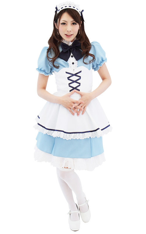 清楚な雰囲気たっぷり!サックスブルーが目に鮮やかなメイドコスプレ衣装。エプロンのフロントに施したネイビーの編み上げリボンが、クラシックな雰囲気を演出。ヘッドドレス調のカチューシャが気分を盛り上げるメイドコスチュームです。※ストッキングは付属しません