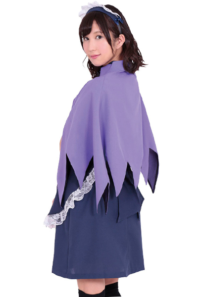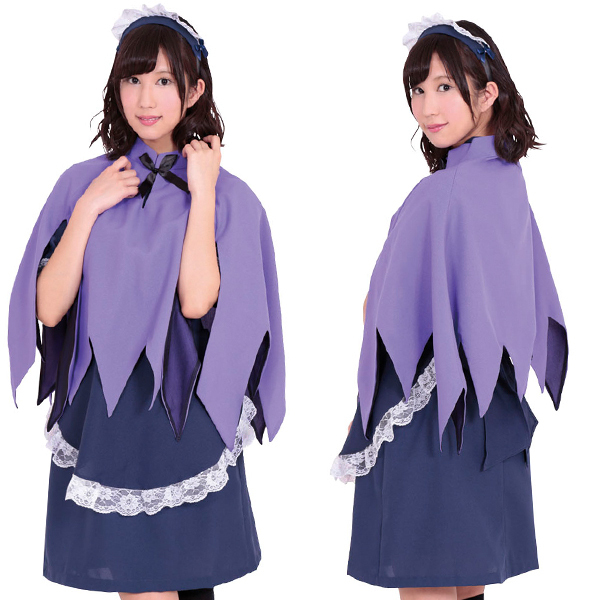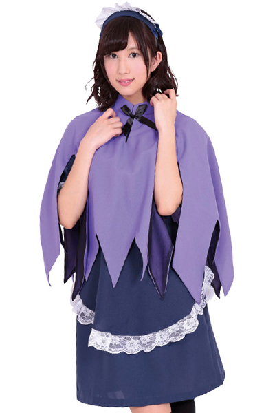 ゴシック調の古い洋館が似合いそう!ミステリアスな紫のマント付きメイドコスチューム(M)。丸襟が可愛いワンピースとエプロン・カチューシャは、ネイビー×白フリルでエレガントに。神秘的な雰囲気を感じさせるクラシカルなメイド服コスプレです。
