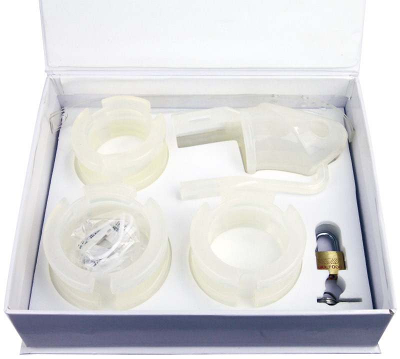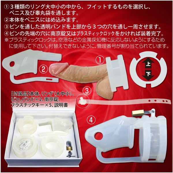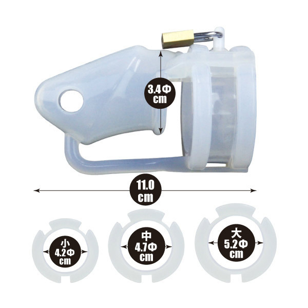 仕様:パッケージ:21.0×17.8×5.3cm 本体:全長11.0cm・ペニス挿入口内径3.4φcm・リング内径小4.2φcm、中4.7φcm、大5.2φcm セット内容:本体・リング3種(大中小)・ピン・バンド×2・南京錠・プラスチックキー×5・日本語説明書