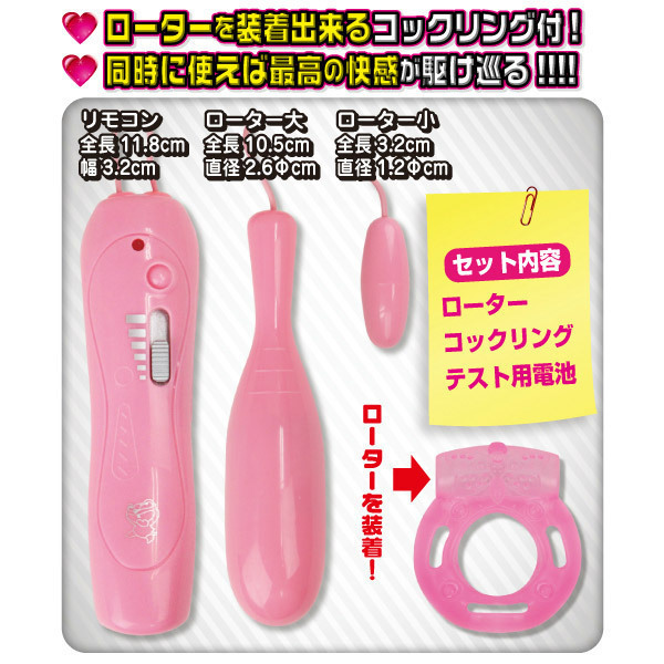 たまご型とスティック型のダブルローターに、男性補助のコックリングがドッキング!大人の遊び心たっぷりなローターセット。たまご型をコックリングに装着すれば電動コックリングに変身!もちろんノーマルなコックリングとしても使用OK。ローターのみでも電動コックリングと併用でも…アイデア次第で色々な楽しみ方が出来る、マルチなアダルトグッズです。単四電池×3本使用。