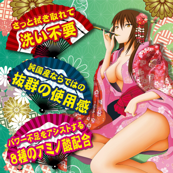 はだけた着物のキャラが色っぽい!8種類のアミノ酸で、勃起力を高める洗い不要ローション。ワンタッチで開いて注ぎやすいシャワーキャップボトルを採用!ねっとりしすぎずサラサラでもない、1番使いやすい粘度で、キミのオナニーをアシストしてくれるクリアローションです。肌への潤い効果が高く、使用後は拭き取るだけで簡単に処理できます。たっぷり600ml入り。