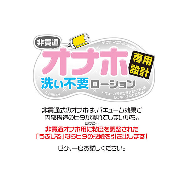 リアルな刺激と快感に近づく第一歩!非貫通型オナホール専用の洗い不要アロマローション「うぶじる」 370ml ストレートタイプ。このローションを使う前に、まずはお気に入りのオナホを用意してしっかり空気抜き!その後に本製品を注入します。モミモミして全体に馴染ませたら準備OK!妄想が膨らむローズの香りに包まれながら、心も身体もムスコも癒されて下さいね。