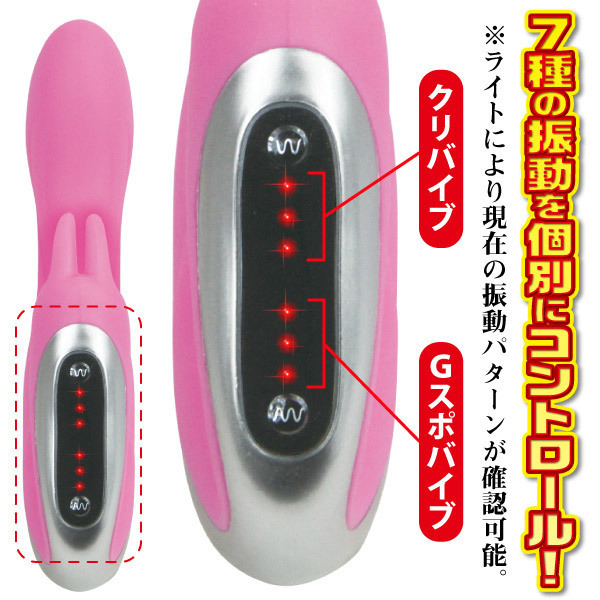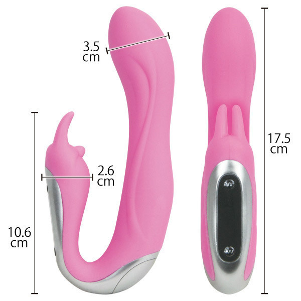 性感帯を挟んで捉えるダブルモーター搭載!独特なU字型フォルムで刺激するパワフルバイブ。本体は挿入しやすく優しい肌触りのシリコンコーティング仕上げ。挿入側と可愛いウサ耳が付いたクリバイブの両先端に、個別で操作できる強力モーターを搭載!Gスポットとクリトリスを挟み込んで刺激します。7種の振動パターンが一目でわかる表示機能も嬉しいポイントです。※電池は付属しません