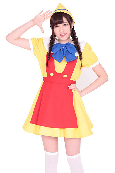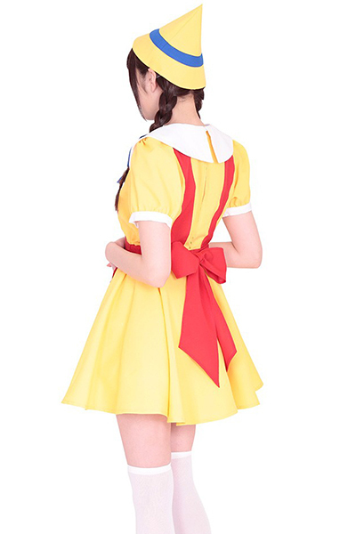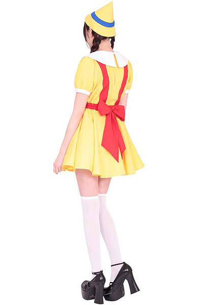 嘘をついたら鼻が伸びちゃう?黄色や赤の鮮やかカラーがキュートなメルヘンコスチューム。真っ赤なエプロンが一体になったワンピースの上には、黒いベストを羽織って可愛らしさ100%!大きな丸襟と三角帽子がさらに愛らしさを強調させる、おとぎの国のコスプレ衣装です。※靴下は付属しません