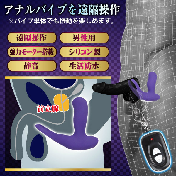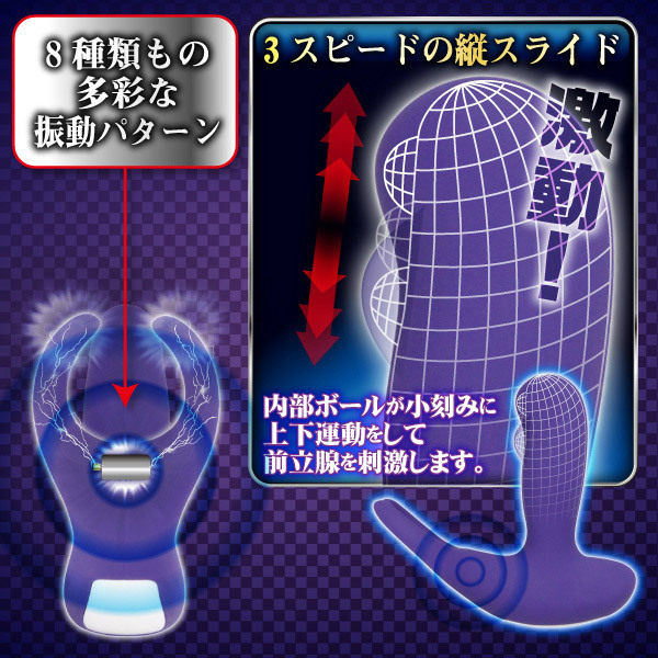 前立腺スポットと蟻の戸渡りをWで猛攻撃!ワイヤレスリモコン操作の電動エネマグラ。●生活防水加工・パープルのソフトシリコンでコート●速度は3段階・前立腺に当たる内蔵ボールが小刻みにスライド●C字リングで後ろから玉袋の根元を完全ホールド●蟻の戸渡りへの振動は8種類・静音ハイパワーモーターを搭載。リモコンはボタン電池式(CR2032)!本体は付属のUSBケーブルで充電します。