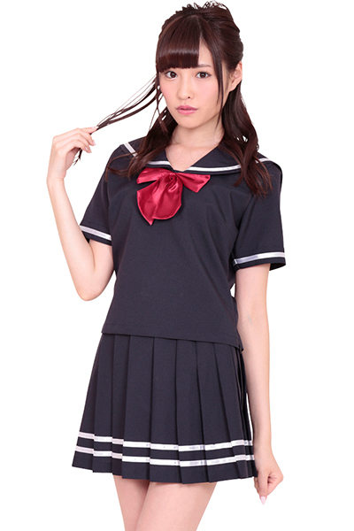 プリーツスカートのダブルラインがカッコいい!濃紺セーラー服コスチューム。●光沢のある細いリボンをラインに採用●襟と袖口は1本線・胸当てなしのシンプルな半袖トップス●襟元へ付属の赤リボンを装着してアクセントに・既に持っているスカーフを結んでもOK。ミニスカ&ニーソックスのコラボで無敵の絶対領域を作り出すコスプレ衣装です。※靴下は付属しません。