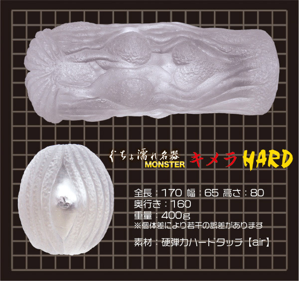 もっとギチギチ!前作よりハードになって登場した硬弾力素材のオナホール。●ぐちょ濡れ名器MONSTERキメラのハードタッチairバージョン●イボヒダ満載・ペニスを締めつけながら至高のギミックで責める●膣内の生態を感じる複雑な造形●裏返し簡単・耐久性が高くメンテナンスが楽●本気汁ローション(内容量50ml)つき。素材が変わるだけでこんなに違うと実感できる高刺激オナホールです。