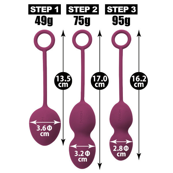 こっそり鍛えて女子力UP♪悩める大人女子の強い味方になってくれる膣トレグッズ。●シックで妖艶なバイオレットカラー●形状&重さの異なるノバボール3種入●滑らかでマットな質感のシリコン製●それぞれ内部にメタルボールを内蔵●まずは49gからスタート→75g→95gと徐々にサイズ&レベルアップ●それぞれ1日30分程度を30日間継続●挿入したままスポーツなども可能●100%完全防水で丸洗いOK。体の動きに合わせてランダムに動くメタルボールを感じよう!最終段階まで進めば、眠っていた骨盤底筋の目覚めを感じられるはず。ソファなどに座りリラックスした状態か、立った状態で片足を上げると挿入しやすくなります。※こちらの商品は受注発注商品の為、ご注文から発送まで2〜3営業日掛かる場合が御座います。
