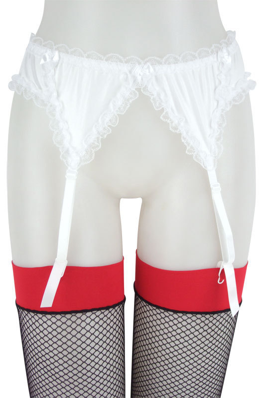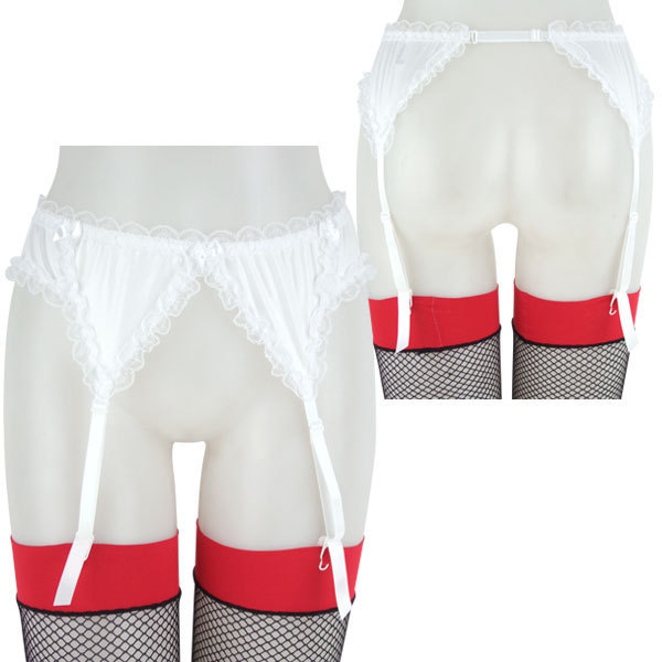 セクシーなガーターベルトもホワイトカラーならキュートに♪光沢素材とフリルレースのガーターベルト。●清楚な印象の純白カラー●エレガントな光沢素材●縁取りはラブリーなスカラップレース●腰回りはアジャスター調整可能。ツヤ感のある純白のグロス素材が特別感を高めてくれるガーターベルト!ガーターストッキングだけでなく、ニーハイソックスとも相性抜群です。※ストッキングは付属しません