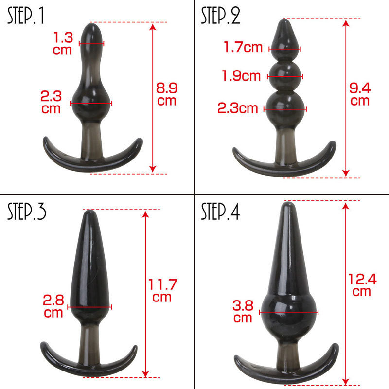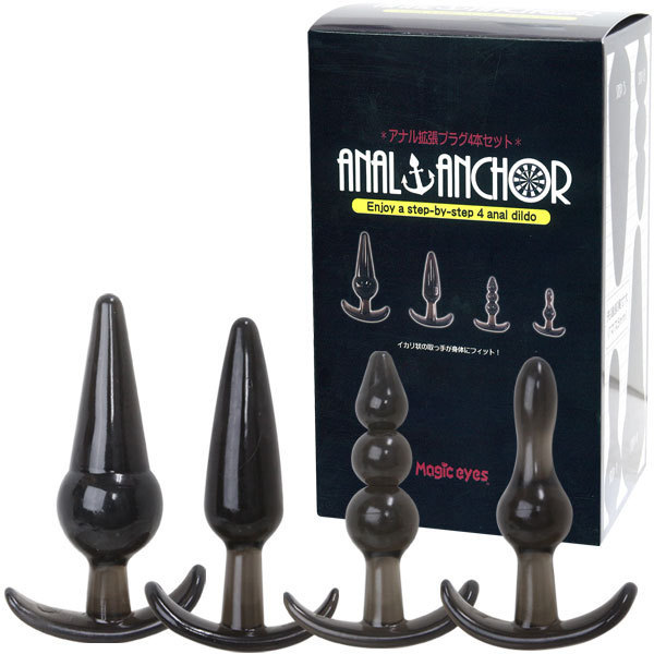 ステップアップ可能な4サイズが集結!イカリ型フォルムの拡張アナルプラグ4本セット。●STEP1〜STEP4まで用途で選べる4サイズ●挿入感抜群の多彩なフォルム●素材臭の少ない高級TRP使用●お尻に優しい程良い弾力性と柔らかさ●使い勝手の良いイカリ型グリップ。拡張を始めたい初心者さんからアナル上級者さんまで満足できる4サイズが勢揃いした高品質なアナルグッズセット!グリップ感の良い持ち手付きなので、前立腺開発もしっかりサポートしてくれる万能アイテムです。