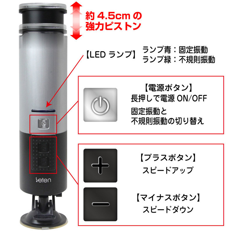 人気ブランド「Leten」商品がついに日本上陸!第一弾は男性用のUSB充電式電動オナホールです。●スタイリッシュなピストンオナホール。●便利なUSB充電式。●2時間の充電で稼働時間は最大90分。●角度調節可能。●平らな場所にしっかり固定できる強力吸盤付き。●取り外し可能・繰り返し使えるインナーホール(イボヒダ構造)。●電源ON/OFF&振動切替え(上ボタン)。●+・-ボタンでスピードアップ&ダウン。●LEDランプ搭載。●最高380回転!約4.5cmの強力ピストン。●5スピード×5パターン調節可能。手を使わずにプレイできるハンズフリーオナニー対応アイテム!極上の刺激と快感を存分に楽しめる電動ピストンオナホールです。