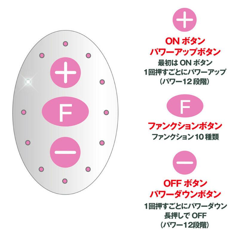 小さいからと侮るなかれ!強力な機能を秘めた超コンパクトローター。●女性の指先程度の全長4cmサイズ●狙った場所を捕えやすい超小型●微〜激まで12段階の強弱切り替え●抑揚を楽しめる10種リズム機能●+…電源ON、弱→強●-…電源OFF(長押し)、強→弱●F…リズム切り替え●生活防水&静音設計。優しい愛撫のような刺激も、荒々しいワイルドな快感もこれ一つでオールOK!120種類ものバリエーションで飽きることなく楽しめるマルチローター。最高14000回転ものハイパワーなので、可愛さに騙されないようご注意を。