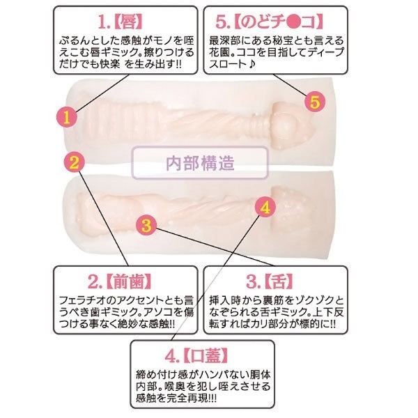 支配感がたまらない!健気にお口でご奉仕してくれるフェラオナホール。●外観凹凸ナシのストレートボディ●リアルな女性の唇を模した挿入口●入口から覗く歯が絶妙アクセント●裏筋をニュルッと刺激する舌突起●ゾリゾリなぞる連続刺激の上あご●上下反転でまた違った快感に。ジュポジュポとディープな挿入感を楽しめるフェラチオプレイを再現!喉奥めがけて突きまくればイラマチオ風なSプレイも可能。唾液系ローションたっぷりでどうぞ。
