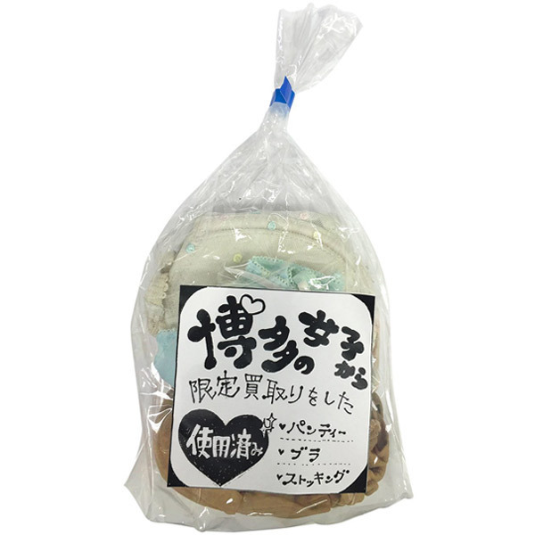 素人博多っ子の下着をまとめて限定買い取り!使用済みのお宝ランジェリー3点セット。●ブラ&ショーツ+ストッキング●デザインはお楽しみのランダム仕様●3点を袋にまとめてお届け。博多の一般女性の汗とフェロモンがたっぷり染みこんだお宝フェティッシュグッズ!五感をフルに活用した妄想オナニーがさらに捗ること間違いなしです。※アソートとなりますので、色・柄・種類のご指定はできません※USED加工を施した新品未使用品です