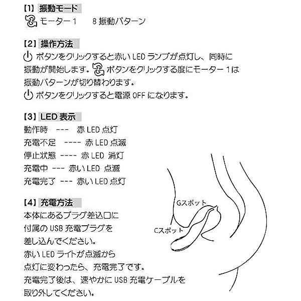 しなやかな曲線がGスポ&クリトリスにフィット!ユニークな洗練ボディのバイブレーター。●高品質シリコン仕様の優しい肌触り●丸みのある愛らしいグリップ部●薄めの先端がGスポットを刺激●中央の内蔵モーターでCスポット(クリ)を刺激●多彩な刺激を生み出す8パターン振動●メンテナンスしやすい生活防水●約2時間の充電で最大1時間稼働●USB充電用ケーブル付属。まるで舌のように波打つユニークなフォルムが、G&Cスポットを的確に刺激!お肌に優しいベルベットさながらの上品な手触りも嬉しいポイントです。