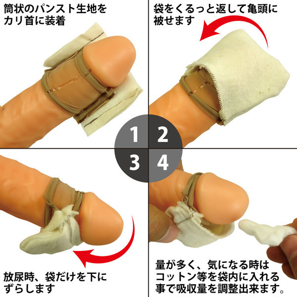用を足した後ズボンにシミを作らない!外出時の強い味方、残尿を徹底ガードする袋状のペニスサポーター。●ネル生地と通気性がいいストッキング素材を採用●パンスト生地をカリに装着して袋を亀頭に被せるだけ●放尿時は袋だけを下におろせばOK●カバー内部にコットンなどを入れると吸収率UP●わずかな漏れもしっかり防止●ズレにくいのでスポーツ時も装着可能。気になる尿漏れを目立たなくしてくれるお助けグッズです。