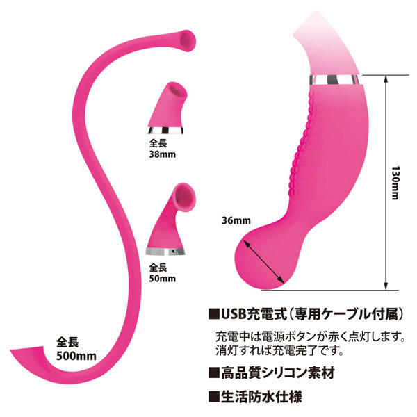 仕様:パッケージ:30.0×11.8×5.3cm 本体:挿入部13.0×3.6cm・アタッチメント小全長3.8cm・アタッチメント中全長5.0cm・アタッチメント大全長50.0cm セット内容:バイブ本体、吸引ホース×3種、充電ケーブル USB充電式