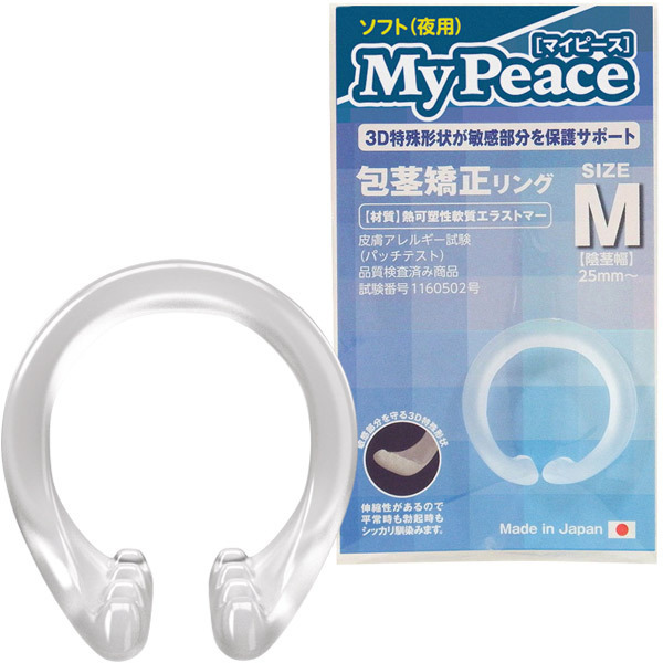 もう悩まなくていい!寝ている間に包茎矯正が可能な男性サポートグッズ。●マイピース・ソフト夜用のMサイズ●着脱しやすいC型●柔軟性の高いエラストマー素材●伸縮性があるので平常時も勃起時も使用可●3D特殊形状●細かい凸凹がズレ&外れを防止●皮膚アレルギー試験済み。包皮を剥きリングの開いている部分が裏筋部分にくるよう装着!個人差はあるものの、絶大な効果が得られる男性補助グッズです。