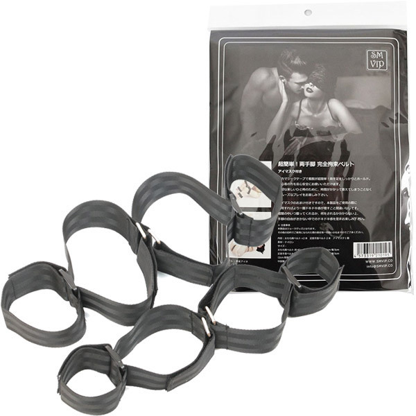 初心者でも楽しめる完全拘束グッズ♪強力マジックテープで両手足を簡単に拘束できる拘束ベルト+アイマスクのセット。●シートベルトのような頑丈素材。●腕枷付き太腿枷ベルト(大)×2個。●手首枷付き足首枷ベルト(小)×2個。●シンプルなマジックテープ着脱。●締め付け具合の調節も自由自在。●視界を塞ぐアイマスクも付属。SM初心者でも簡単に卑猥なポーズにホールド!両腕&両足をまとめて拘束できる、完全拘束のためのグッズです。枷で自由を奪いながら付属のアイマスクも併用すれば、より一層興奮度も高まります。