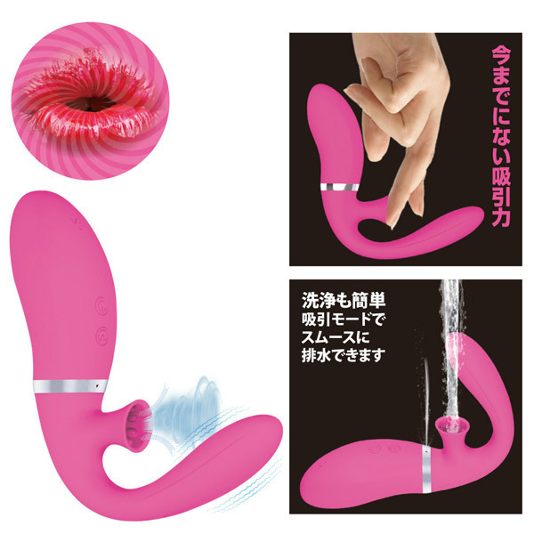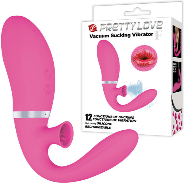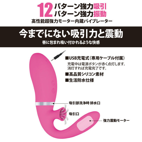 挿入しながら強力バキューム♪クリバイブに吸引機能を搭載した新感覚のバキュームバイブレーター「プリティラブ バキュームサッキングバイブレーターF」。クリ吸引グッズとGスポットバイブが合体!ありそうでなかったF字型バイブレーター。セルフプレイに最適なF型フォルムで驚きのフィット感を体感!肌触り抜群の高品質シリコンボディは全長10cm、最大径は3cm。挿入部ヘッドに内蔵された高性能モーターがGスポットを刺激。さらに、唇に吸い付かれるような刺激を生み出す吸引機能を搭載!強力な12パターンの吸引&振動を味わえます。フル充電約90分で連続稼働約50分のUSB充電式(専用ケーブル付属)。クリ吸引部洗浄用の排水口が配置された生活防水仕様!内部までしっかり洗えるので衛生的です。