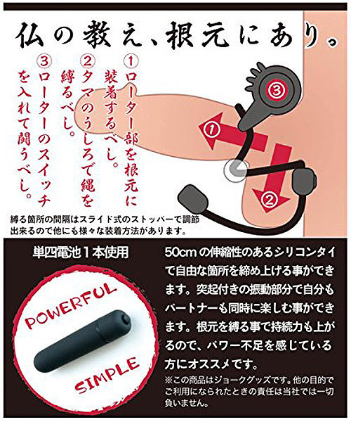 男の快感を助太刀!ロングなループタイデザインの電動ペニスリング「SUKEDACHINAWA(スケダチナワ)法」。●伸縮性のあるシリコンタイ●長さ約50cmのロングタイプ●スライド式で簡単に調整可●クリ用突起付きのローター●簡単操作のワンタッチ電源●ローターは着脱可能。仏の教え、根元にあり!ロングなシリコンタイでお好きな箇所を自在に締め上げる男性用補助グッズ。ローター部を根元に装着し、玉袋の後ろで縄を縛ってローターのスイッチをON!締め付けによる持久力UPだけでなく、クリトリスに刺激を与えるローター搭載でパートナーと快感を共有可能!快感もパワー不足もアシストしてくれるマルチなアイテムです。