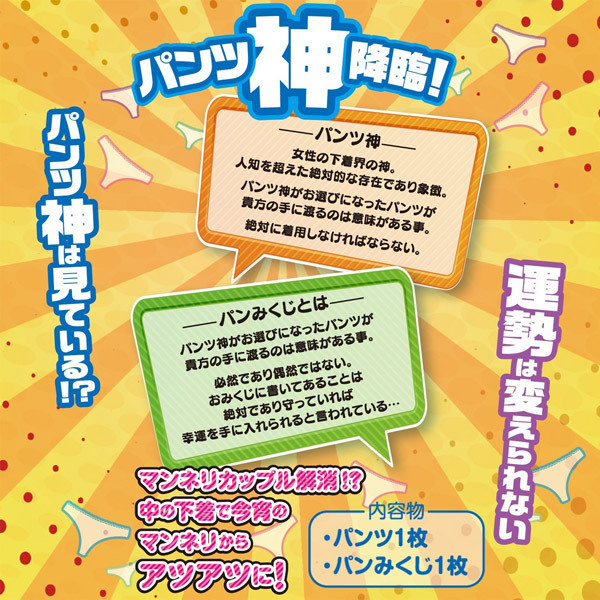 あなたの運命は神のみぞ知る?おみくじシート付きセクシーショーツBOX。●パンティ1枚+おみくじ1枚●カラーやデザインはランダム●彼女や友人へのプレゼントに●各種イベントの販促グッズに。パンティには神が宿っている!かどうかは分かりませんが、届いたパンツの色や形によって運勢が決まる(かもしれない)おみくじ付きパンティ。女性の下着界における絶対的な存在であり象徴である「パンツ神」に運命を委ねてみてはいかがでしょうか。