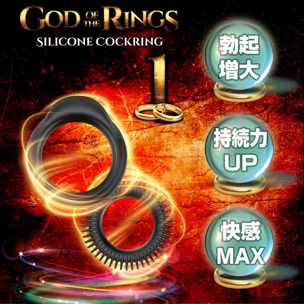 勃起増大、持久力UP、快感MAX!高品質シリコン製コックリング2種セット「ゴッドオブザリング 1」。細かなヒダがびっしり並んだ刺激的なフォルムの小リングは内径2.0cm、シンプル形状の大リングは内径3.4cm。大リングには持ち手のように摘めるベロがあるので位置調整がしやすくなっています。男性自身をしっかり締め付けて強力サポートするペニスリング2種セット!2個同時に装着すれば神の如きパワーがその竿に宿るかも。