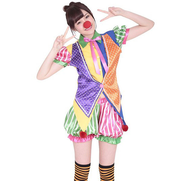 キュートな道化師に変身♪カラフルポップなピエロガールコスチューム。アシンメトリーカラーのドット柄ベストと一体になったカラフルなリボン付きブラウスと、ストライプ柄かぼちゃパンツのセット。トップスの裾には遊び心たっぷりの赤ポンポンも♪ピエロの仮装には欠かせない真ん丸なつけ鼻も付属しています。※セット内容以外は付属しておりません。