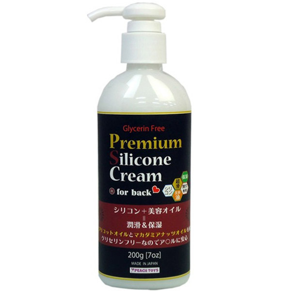 シリコン+美容オイルでしっかり潤滑&保湿!グリセリンフリーのアナル専用クリームローション「プレミアムシリコンクリーム 200g」。●乾きにくく潤滑持続力抜群●美容オイル配合で保湿力◎●安心安全グリセリンフリー●シルクのような極上の滑り●便利なポンプタイプ容器●内容量たっぷり200g入り。潤滑持続力+保湿力に加え、抗菌にも対応!安心安全なアナル専用の潤滑剤です。【内容成分】精製水・PG・ミネラルオイル・トリイソステアリン酸・PEG-15水添ヒマシ油・ジメチコン・シクロペンタ・シロキサン・カルボマー・マカダミアナッツオイル・アプリコットカーネルオイル・アロエベラエキス・ニンニクエキス・カキタンニン・緑茶エキス・ヒアルロン酸・AG・ポリアクリル酸Na・ヒドロキシエチルセルロース・エタノール・DPG・メチルパラベン・エチルパラベン・水酸化Na。