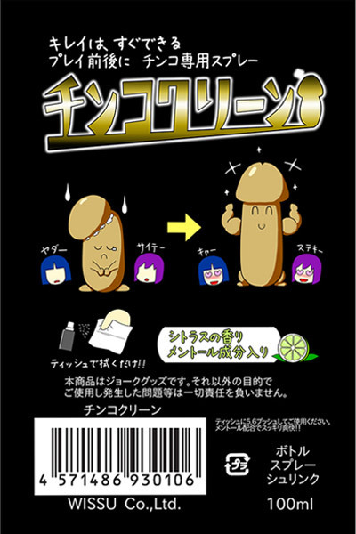 プレイ前後のエチケットにサッとひと拭きでリフレッシュ!爽快なメントール入りのペニス専用スプレー式クリーナー「チンコクリーン 100ml」。●拭くだけの簡単スプレータイプ●メントール成分入りでさっぱり●爽やかなシトラスの香り付き。シュッとして拭き取るだけで清潔に!メントールのクールなさっぱり感が心地良いチンコ専用クリーナー。ティッシュ2〜3枚がしっとりと湿る程度に7〜8プッシュしたら、アソコをフキフキするだけの簡単仕様!フェラチオ前のエチケットや、オナニー後の賢者タイムにもどうぞ。