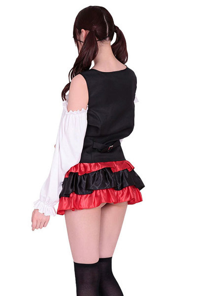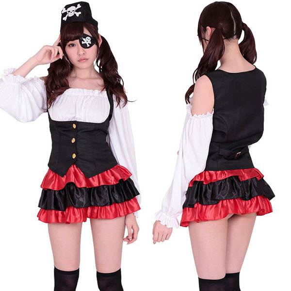 眼帯コスプレ好きは注目!キュートなパイレーツガールに変身♪ハロウィン仮装にピッタリな海賊コスチューム。オフショルダーブラウス付きのベストと、黒×赤カラーの光沢ティアードフリルスカートのセット!眼帯&スカーフ帽の小物も付属した充実セットのパイレーツ衣装です。眼帯付きのコスプレをするならせひどうぞ!