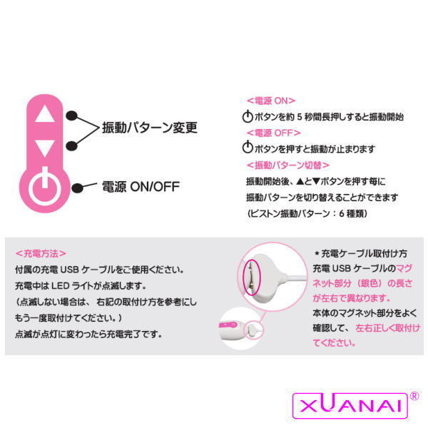 ズンズン突き上げる超快感!振動+回転+ピストン機能を搭載した『xuanai(シェンアイ)』ブランドのローリングピストンバイブ「XUANAI VATERO」。シリコン製ボディの先端部分に内蔵されているパールがグルグル回転刺激しながら、上下に激しく動く最大幅1cmのピストン機能で奥までズンズン突き上げます。さらに、クリバイブにもパワフルモーターを内蔵!ローリング&ピストンは3パターン、振動は12パターンからお好みで選択可能です。約2.5時間のフル充電で最大45分稼動するUSB充電式バイブのxuanai!ワンタッチ着脱のマグネット式充電ケーブルも付属しています。