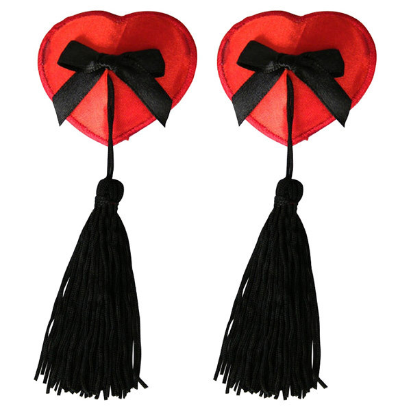 ピタッと貼るだけの簡単仕様♪バストトップ(乳首)に貼るだけで、手軽にオシャレが楽しめる下着感覚のニップルジュエリー「ニップルタッセル ハート&リボン 赤」。同色ペア1組セット、複数回使用できる強力粘着シールタイプのボディアクセ。可愛らしいハート型ニップル&リボンと、ゆらゆら揺れるタッセルを組み合わせたゴージャスなデザインは、ショータイムやナイトパーティーにも最適です。