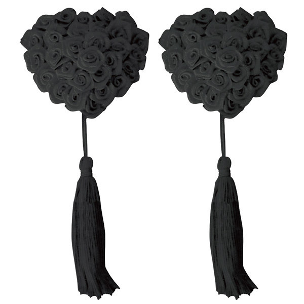 ピタッと貼るだけの簡単仕様♪バストトップ(乳首)に貼るだけで、手軽にオシャレが楽しめる下着感覚のニップルジュエリー「ニップルタッセル ローズデコレーション 黒」。同色ペア1組セット、複数回使用できる強力粘着シールタイプのボディアクセ。真っ黒なバラで贅沢にデコレーションしたハート型ニップルと、ゆらゆら揺れるタッセルを組み合わせたゴージャスなデザインは、ショータイムやナイトパーティーにも最適です。