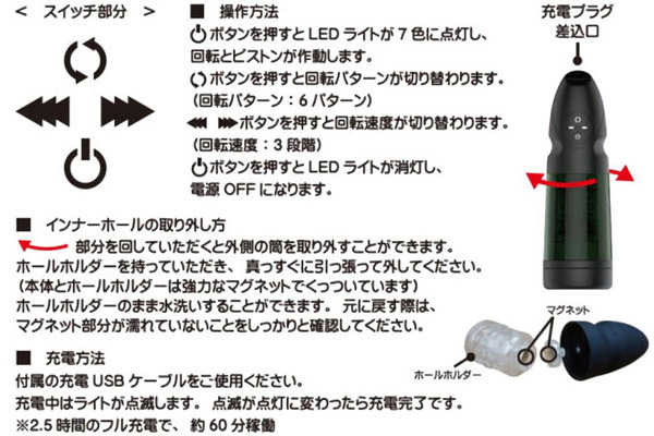 片手で持ちやすい簡単操作の電動ホール「オーロラカップ」が登場しました!こちらの商品は「6種類の回転パターン」と「3段階の回転スピード」の切替ができるのが特徴で、内部のホールが上下にピストンすることでパワフルな高刺激を与えてくれるほか、使用中はムードに合わせてLEDがカラフルに点滅することで、他にはない新鮮さを味わわせてくれます。本体はとてもスリムで軽く、操作性抜群で動作音も静かなので音を気にせずご使用頂けます!ご使用後は内蔵されているカップ式ホールを取り外すことで洗浄が可能です。