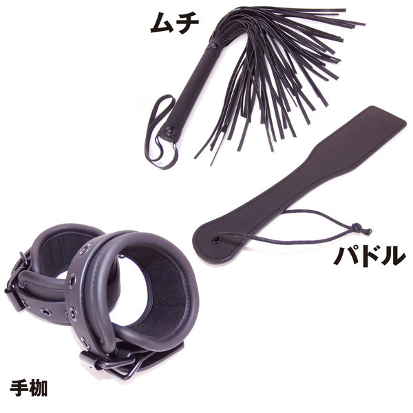 仕様:パッケージ:26.0×35.9×6.0cm セット内容:首輪、ボールギャグ、アイマスク、足枷、パドル、ムチ、手枷