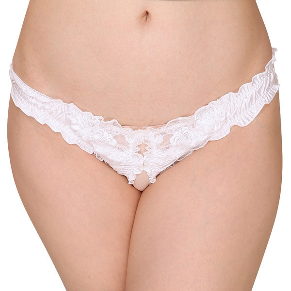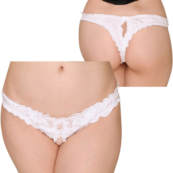 フロントにフラワーレースをあしらったエレガントなデザインショーツで、光沢感が華やかに魅せてくれています♪ホワイトカラーで清純そうに感じられますが、実は結構大胆な作りとなっていて、よく見てみるとクロッチ部分がオープンになっているというエロティック仕様。後ろはTバックスタイルとなっているから、お尻もしっかりアピールできるようになっています♪ナイトプレイに用いれば、その見た目のギャップにパートナーの性欲も掻き立てられることでしょう。