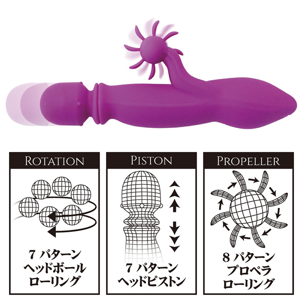 ピストン&プロペラ回転とヘッド部分に内蔵されているムービングボールにより、女性器を徹底的に責め立てるウインドミルバイブ!大回転するプロペラがクリをガッツリ愛撫しながら、強力ピストンヘッドがボルチオもしっかりと開発。内蔵ボールが回転することで、Gスポットも刺激してくれるマルチな快感が楽しめるウインドミルなバイブです♪ボディ全体が高品質なシリコン素材で出来ているので肌触りが良く、フレキシブルに曲がる柔軟なネックのプロペラがクリにフィットし確実に快感刺激を伝えてくれます。7パターンのヘッドピストンに7パターンの内蔵ボール回転、さらには8パターンのプロペラローリング機能が付いているため、飽きのこない快感の波をお楽しみいただけます♪生活防水仕様だからメンテもラクラク!USB充電式(コード付属)なので電池切れの心配もありません。