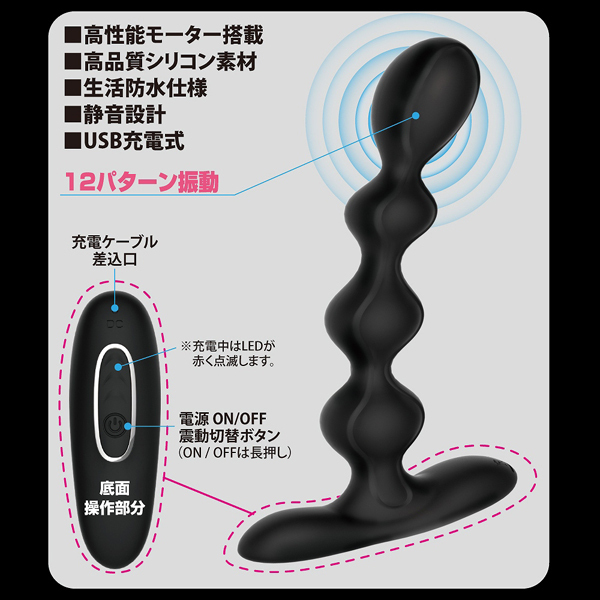 「スティックバキューマー2」等の吸引グッズでお馴染みのプリティラブから新商品が登場!身体の芯に響くような刺激が堪能できる全長17.5cmのロングボディのシリコン製アナルバイブレーター(USB充電式)。先端に内蔵された高性能モーターが、お尻の中で12種類のハイパワー振動!最大内径27mmのビーズでポコポコと刺激しながら根元まで入れれば底面が会陰を刺激、前立腺を貫く刺激と相まった強い快感に息も絶えだえに♪この強烈な振動は貴方の想像を絶する!!充電コード付属