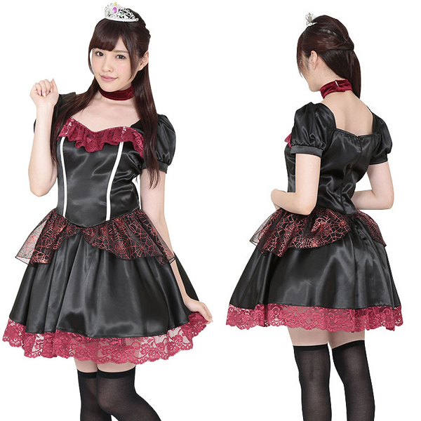 深夜0時を過ぎれば闇のプリンセスのお出まし!ダークでゴシックな雰囲気が味わえるハロウィンコスプレ衣装。黒の艶やかな生地にアンティークな風合いのレッドスカラップレースをあしらい、ウエスト周りには蜘蛛の巣デザインのレースを施したゴシックスタイル!付属している真紅のチョーカーとキラキラ輝くティアラを身に付ければ、気分はもう闇堕ちプリンセス♪ハロウィン気分を更に盛り上げるなら、タトゥーシールを貼ってみるのも◎
