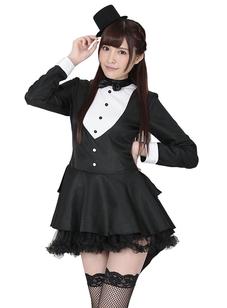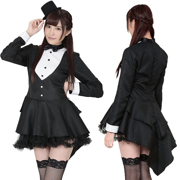 タキシードと言えば正装のきっちりとしたイメージが強いですよね。しかしそんなイメージを払拭!フリルと黒のチュールレースでボリュームを持たせて可愛くガーリーに仕上げました♪また、数あるタキシードのタイプから格式の高いテールコート(燕尾服)をチョイス!燕尾にフリル感をプラスすることで女性人気の高いフィッシュテール風にデザインしています。セットのミニハットを被れば一層可愛さUP!ステッキが有ればなお気分が高まります♪※こちらの商品は受注発注商品の為、ご注文から発送までに3、4営業日掛かる場合が御座います。