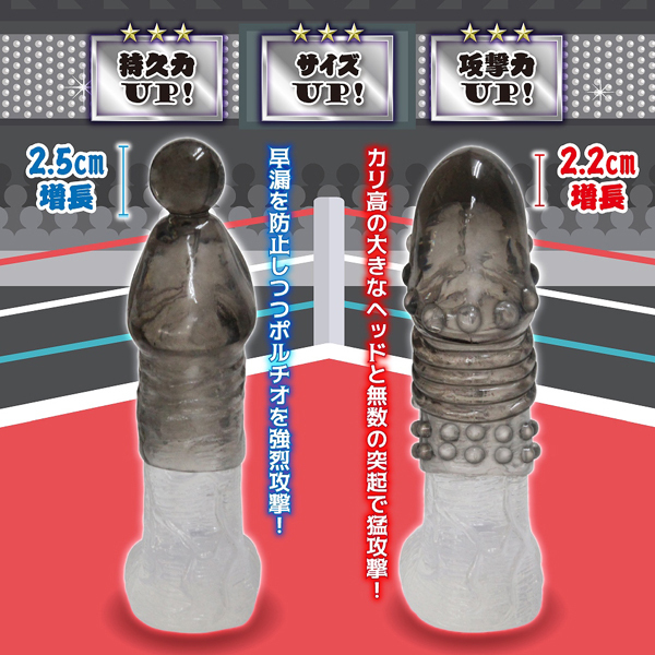 コンドームのように被せるだけでカップルの夜を刺激的にするペニスサック2個セット。クリアとは違い、スモーキーな色味が一層凶悪な印象を与えるコチラ!ユニークな形状でパートナーを責めたてる「モンスターサック」のように、ボール状の突起が付いたヘッドと、無数の突起が配置されたカリが大きなヘッドで、二人のセックスをより気持ち良く興奮度もMAXに高めます♪マンネリ気味なカップルさんや、男性としての自信を取り戻したい方に!