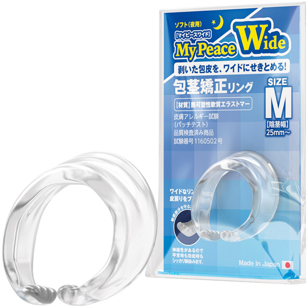 ロープライスで人気の包茎矯正用リングが3倍ワイドになってバージョンアップ!従来よりもズレにくく、さらに外れにくくなりました。包皮を剥いてワンタッチ装着することで亀頭を露出し、清潔さをキープ!付けていることで段々と剥きグセがつき、男らしい剥きグセへと近づけてくれます♪最大の特長は尿道や裏筋を締め付けない特許取得済み(意匠登録第1544081号)のオープンなC型リングと、人間工学に基づいた3D特殊形状。丸みを帯びた特殊形状の両端はズレにくく、リング内側の絶妙な傾き加工がカリ首にジャストフィットし分厚い皮の逆流を堤防のようにせき止めてくれます。男性のデリケート部分に直接触れるからこそ、信頼性の高い日本製エラストマー「メディカルスキン」を採用♪勃起時にも自然と広がることで一定のテンションでサオをホールドし、うっかり脱落させて紛失してしまうこともありません!こちらはソフトな夜用のMサイズになります♪
