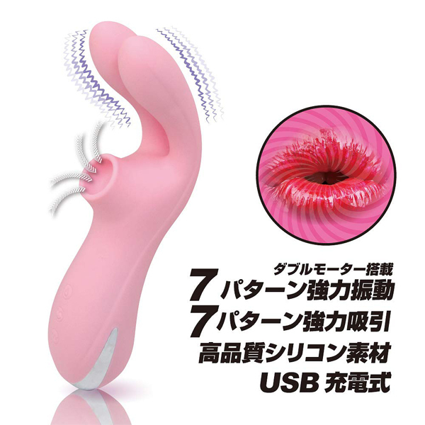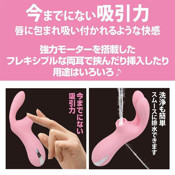 振動&吸引機能。今までにない吸引力!唇に包まれ吸い付かれるような快感。強力モーターを搭載した、フレキシブルな両耳で「挟んだり」「挿入したり」用途はいろいろ♪●7パターン振動●7パターン吸引●高品質シリコン素材●生活防水●静音設計●専用USB充電コード付属、充電時間:60分、 連続稼働時間:40分
