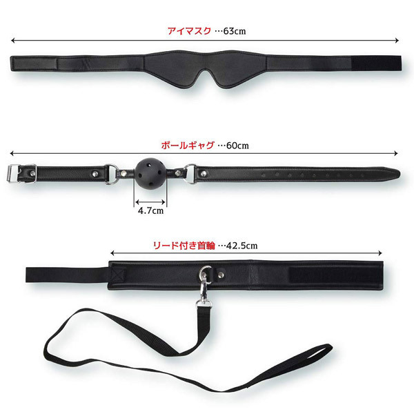 仕様:フリーサイズ パッケージ:31.0×19.0×7.5cm セット内容:アイマスク、ボールギャグ、リード付き首輪、手枷、バラムチ